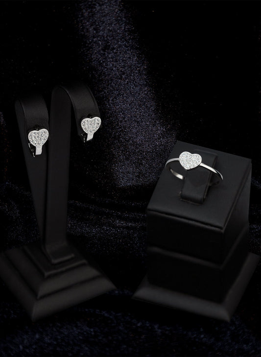 925 Sterling Silver Diamond Heart Shape Set 2 Pieces: Ring & Earrings