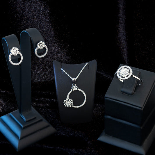 925 Sterling Silver Circle Daisy Shape Jewelry Set 3 Pieces: Necklace, Ring & Earrings