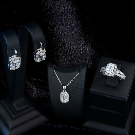 925 Sterling Silver Big Diamond Jewelry Set 3 Pieces: Necklace, Ring & Earrings