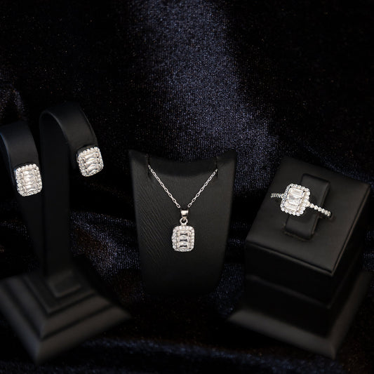925 Sterling Silver Square Diamond Shape Set 3 Pieces: Necklace, Ring & Earrings