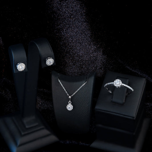 925 Sterling Silver Dainty Diamond Jewelry Set 3 Pieces: Necklace, Ring & Earrings
