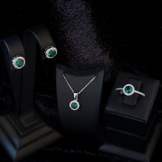 925 Sterling Silver Green Solitaire Shape Set 3 Pieces: Necklace, Ring & Earrings