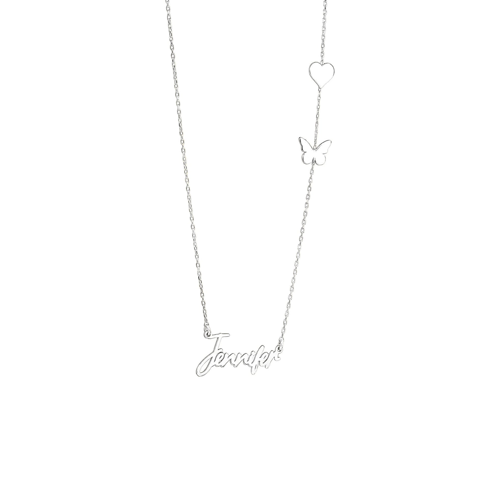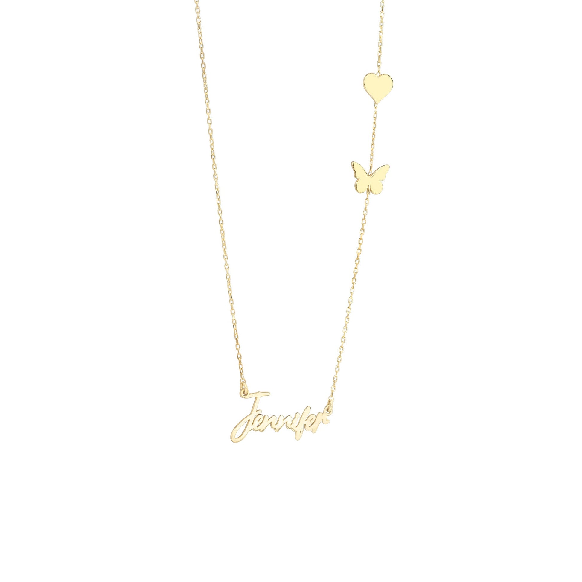 14K Solid Gold Personalized Name Necklace with Heart and Butterfly