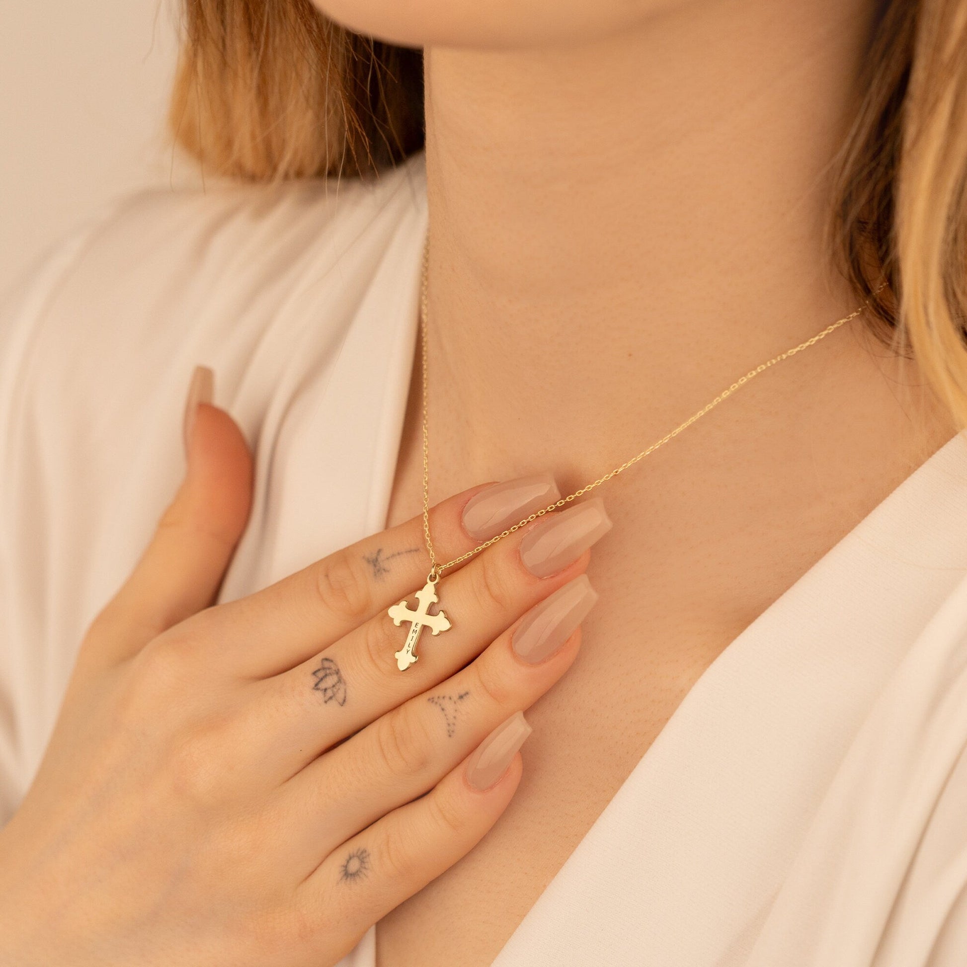 Experience the beauty and meaning of faith with our 925 Sterling Silver Eastern Orthodox Cross Name Necklace. This elegant piece is perfect for a special gift, featuring a unique religious charm and customizable name inscription. Embrace the timeless tradition with this stunning Christian jewelry gift for her.
