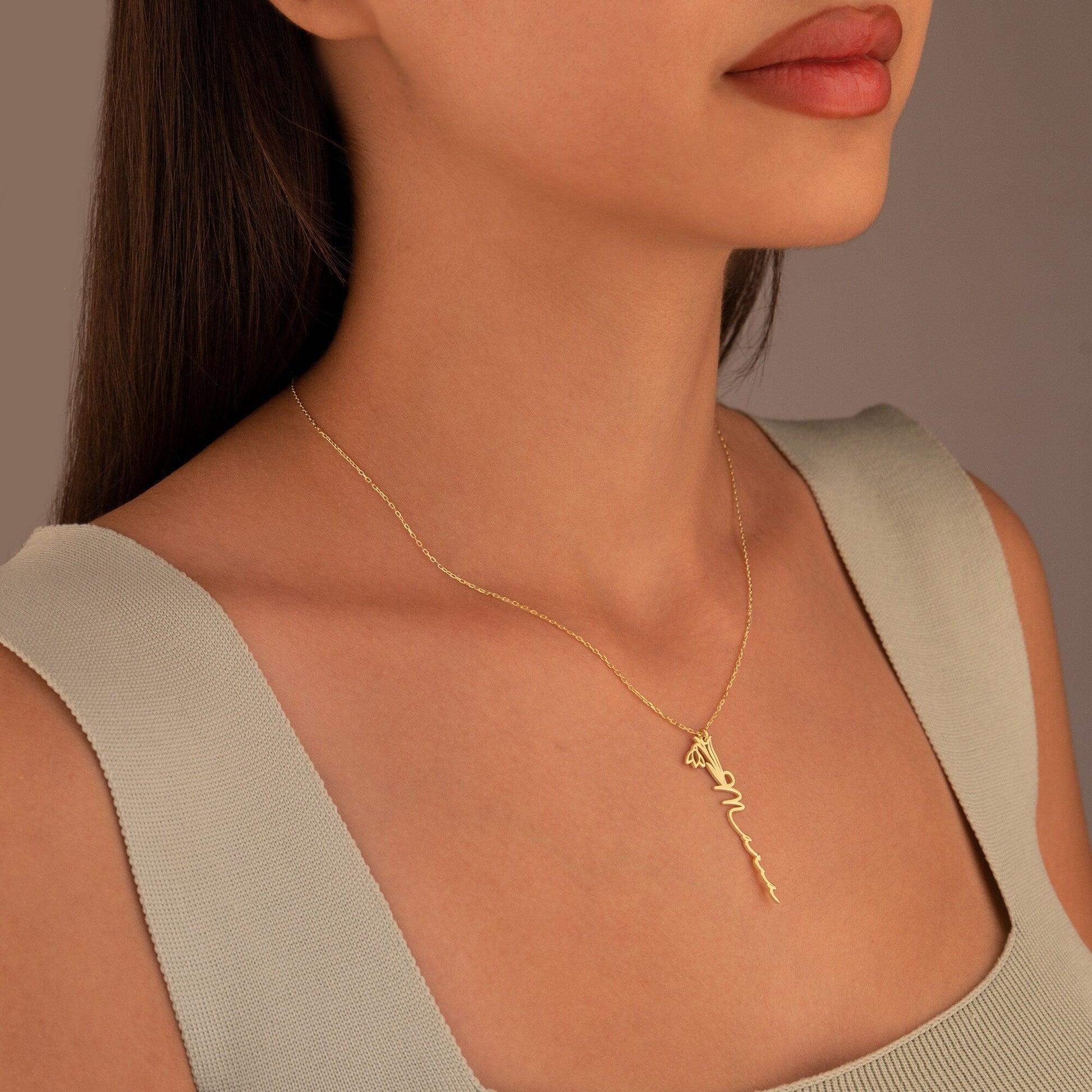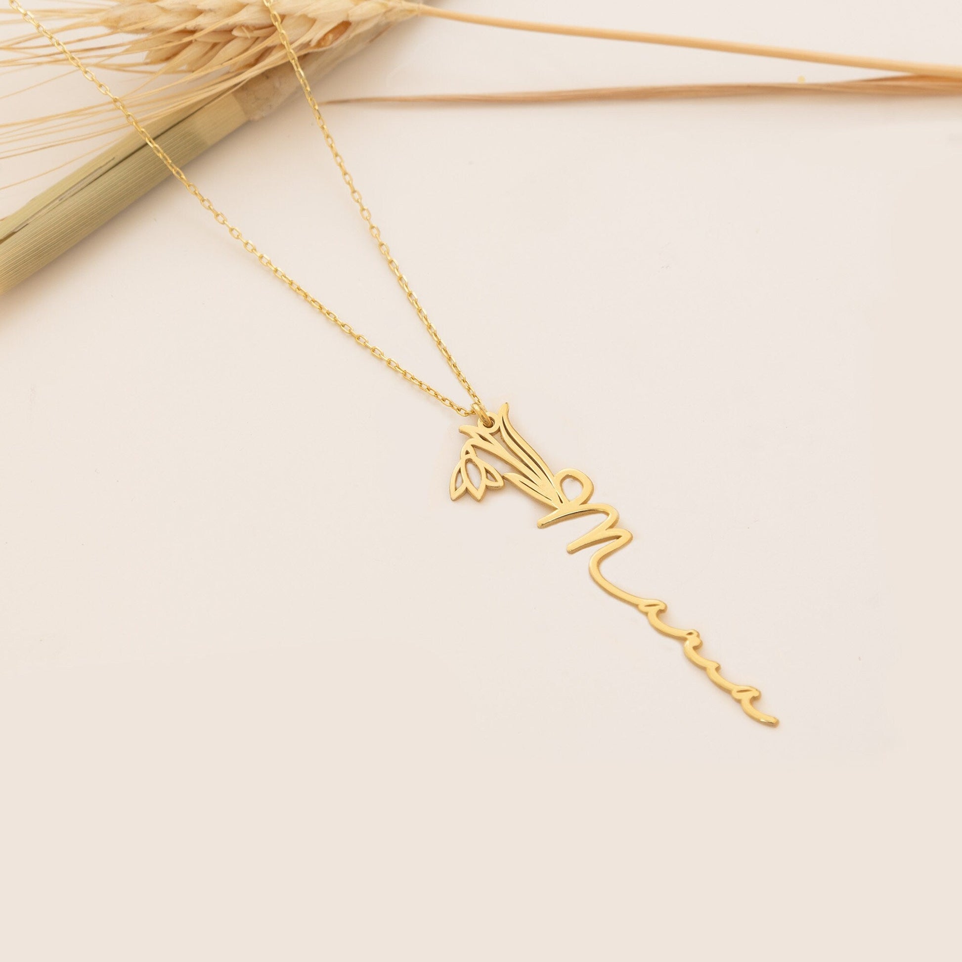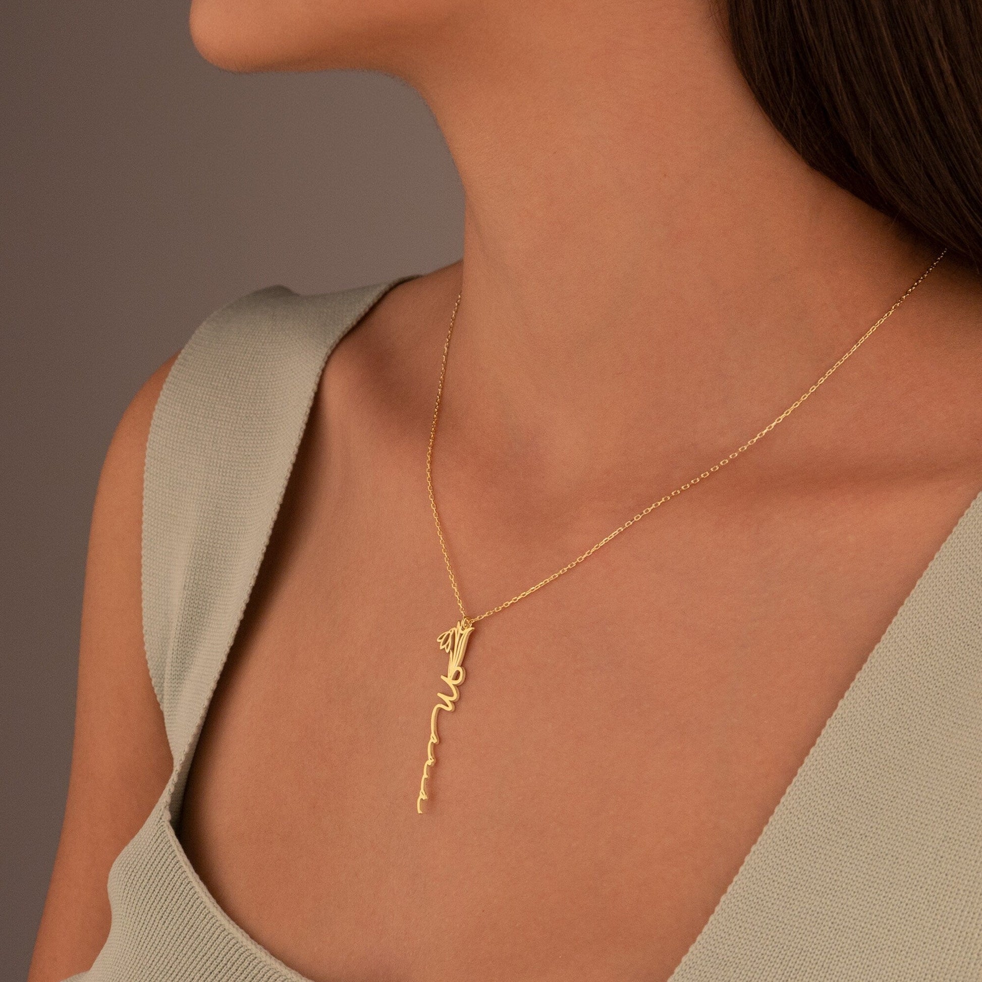 Dainty Birth Flower Gold Name Necklace - Custom Vertical Name Necklace - Silver Tiny Birth Flower Necklace