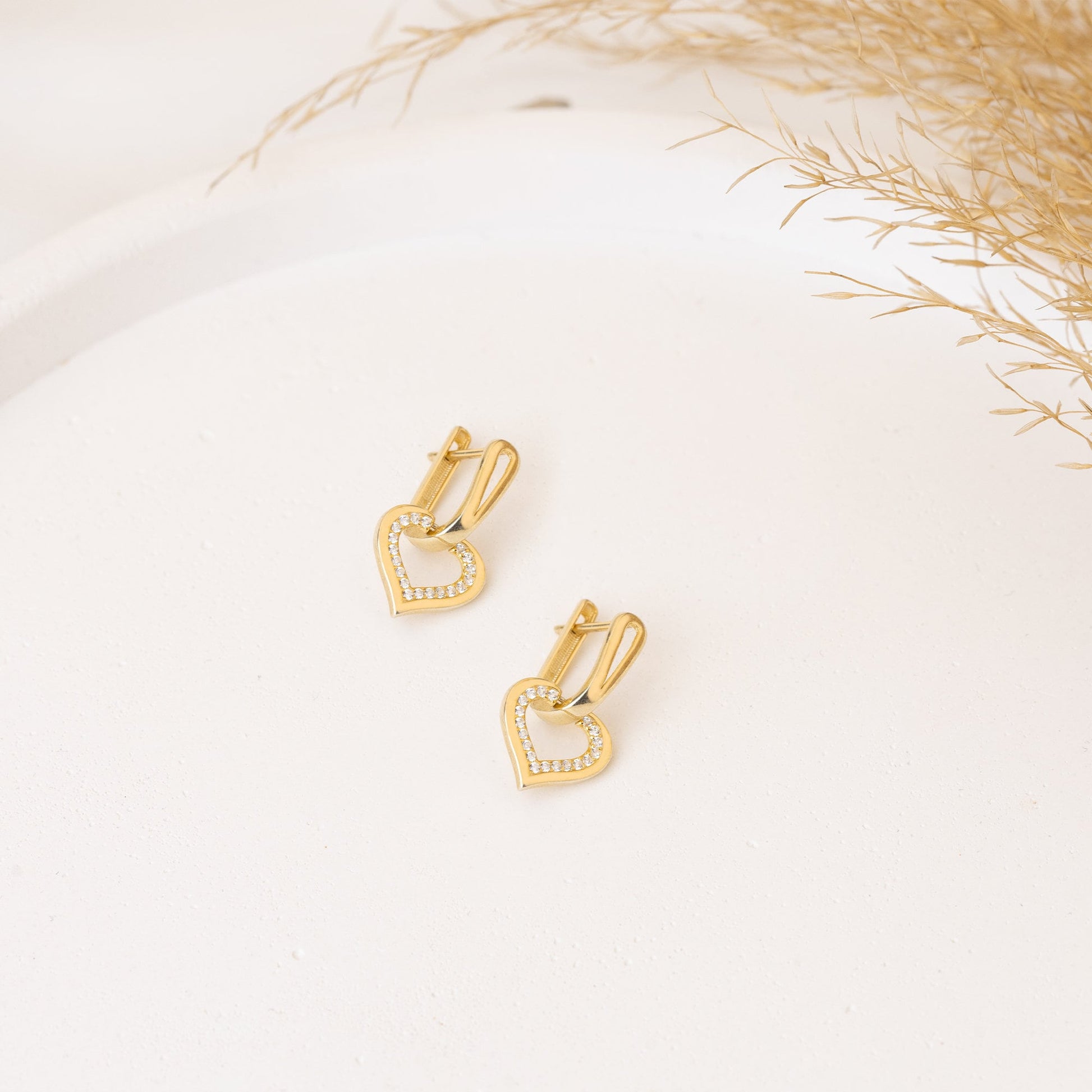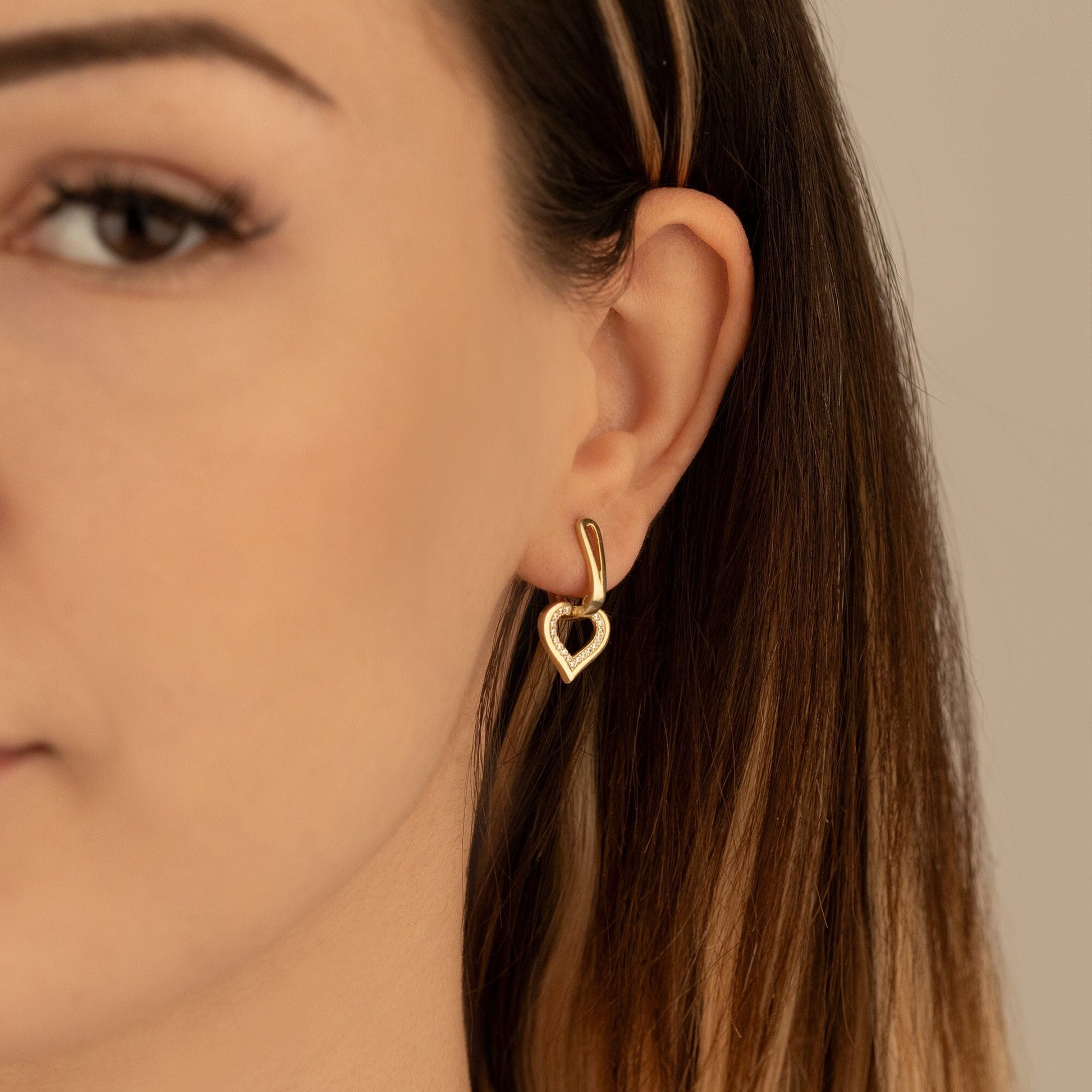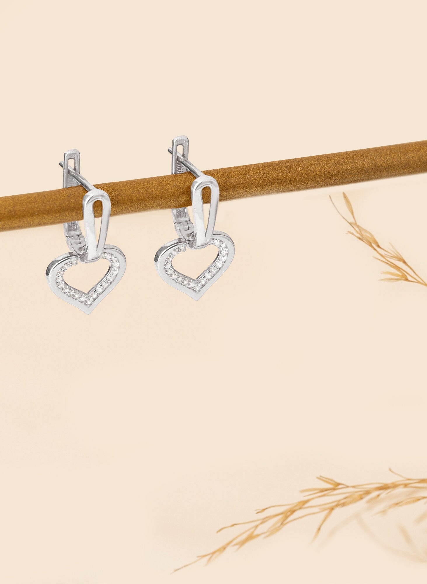 925 Sterling Silver Dangle Diamond Pave Heart Hoop Earrings
