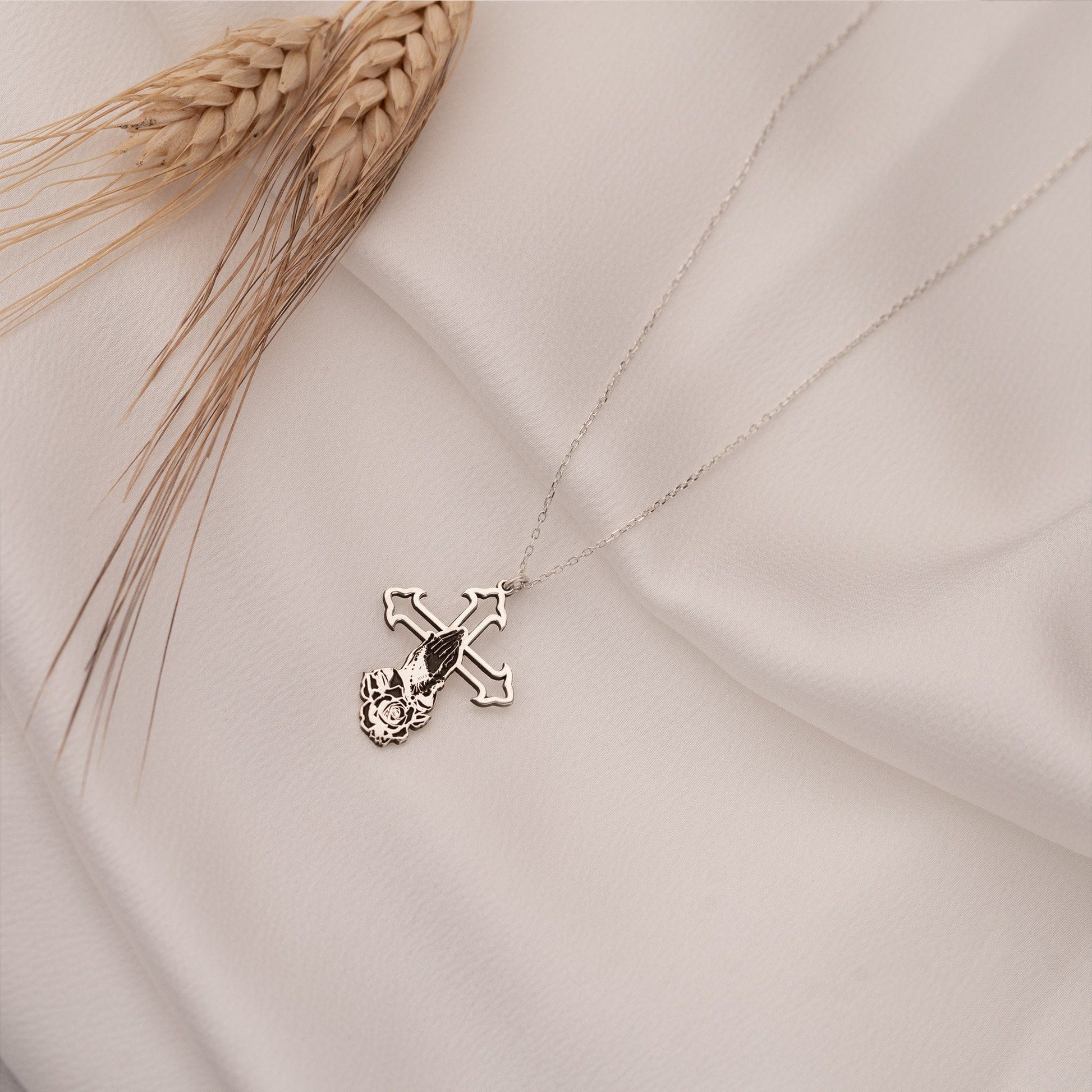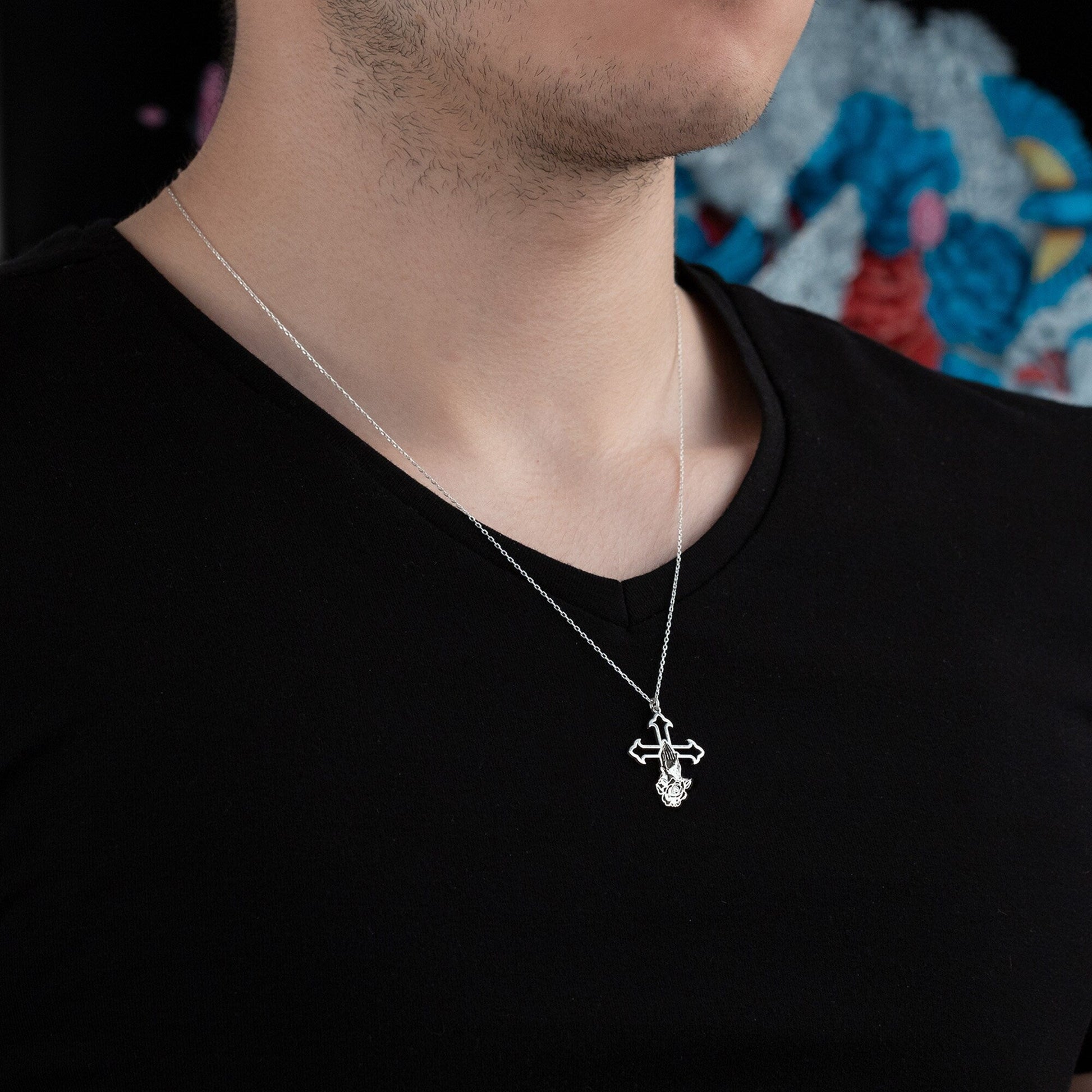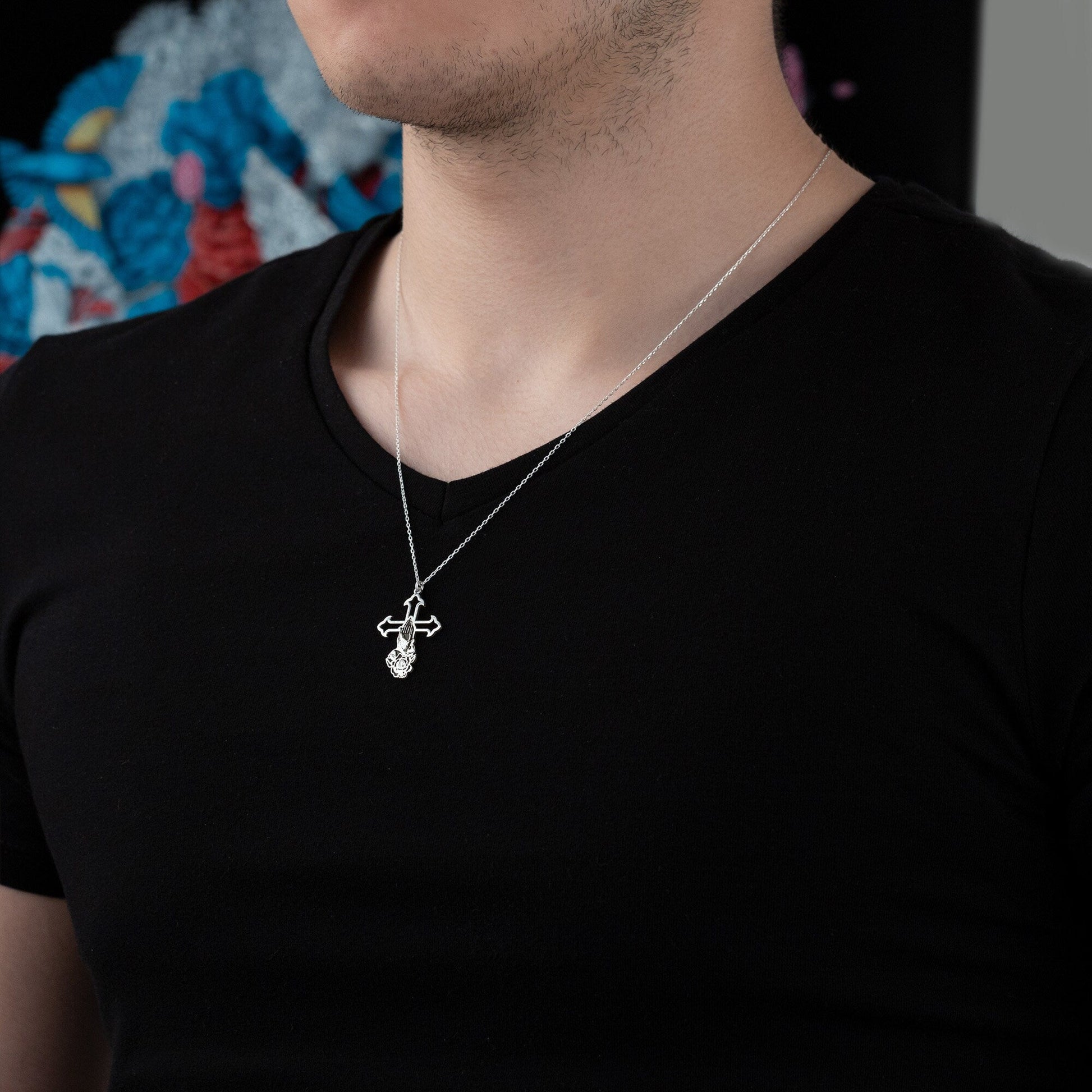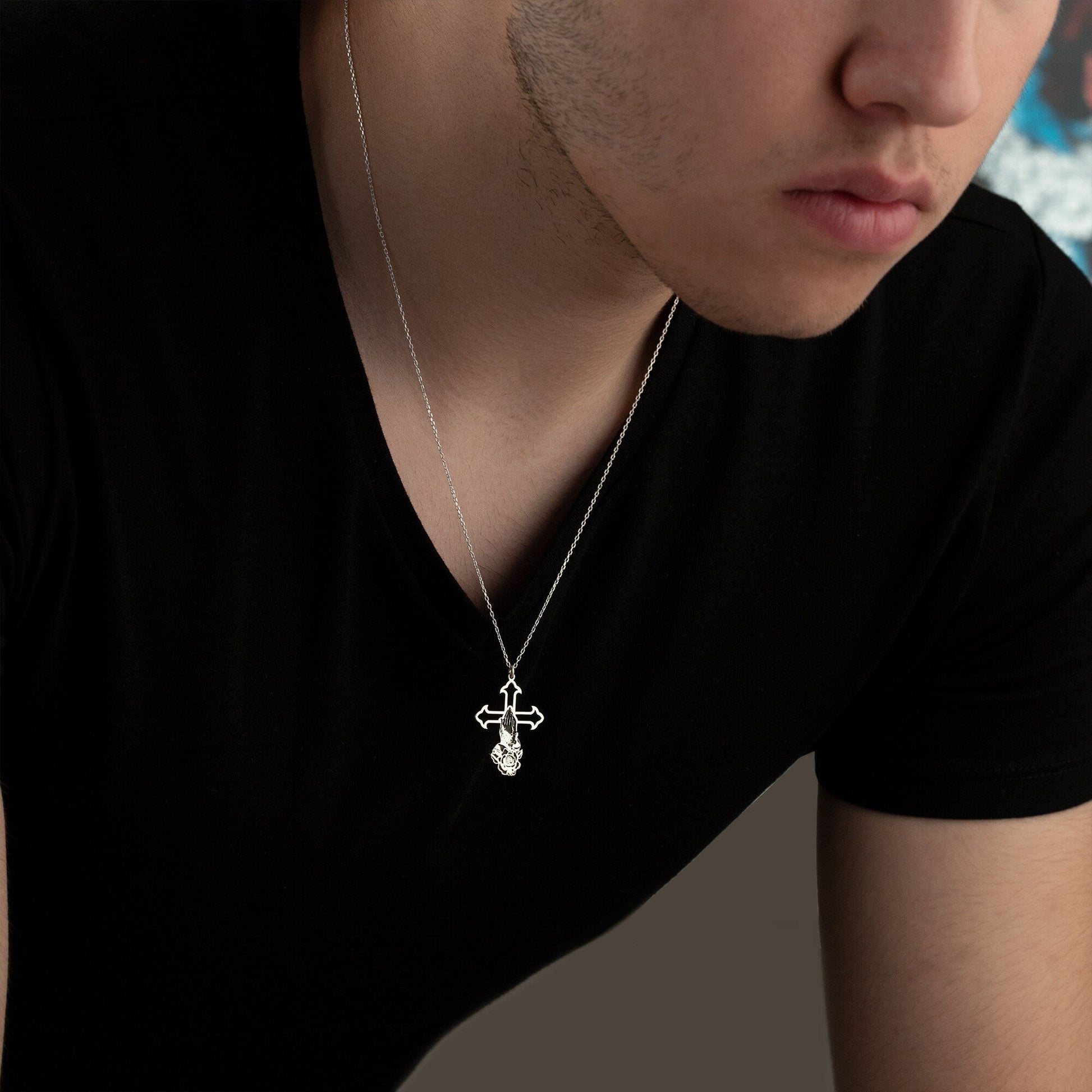 Praying Hands Crucifix Necklace - Cross with Rose Necklace - Christian Jewelry - Faith Gift - Gift For Christian - Gift for Man - Cross Necklace - Gift for Him