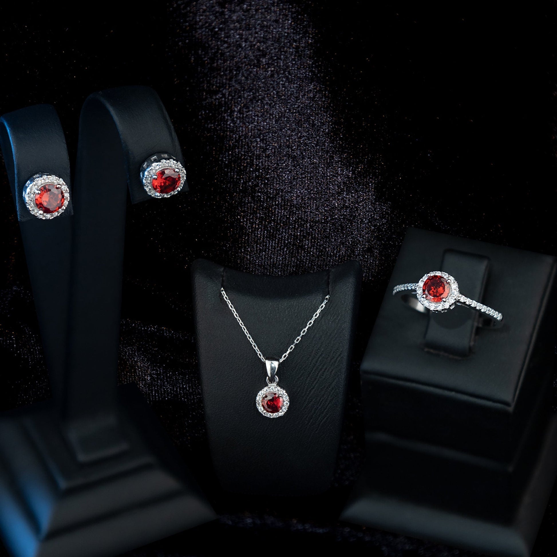 Red Solitaire Shape Jewelry Set 3 pieces: Necklace, Ring & Earrings - Valentine's Day Gift - 925 Sterling Silver Jewelry Set - Gift for Her - Handmade Pendant - Gift for Wife