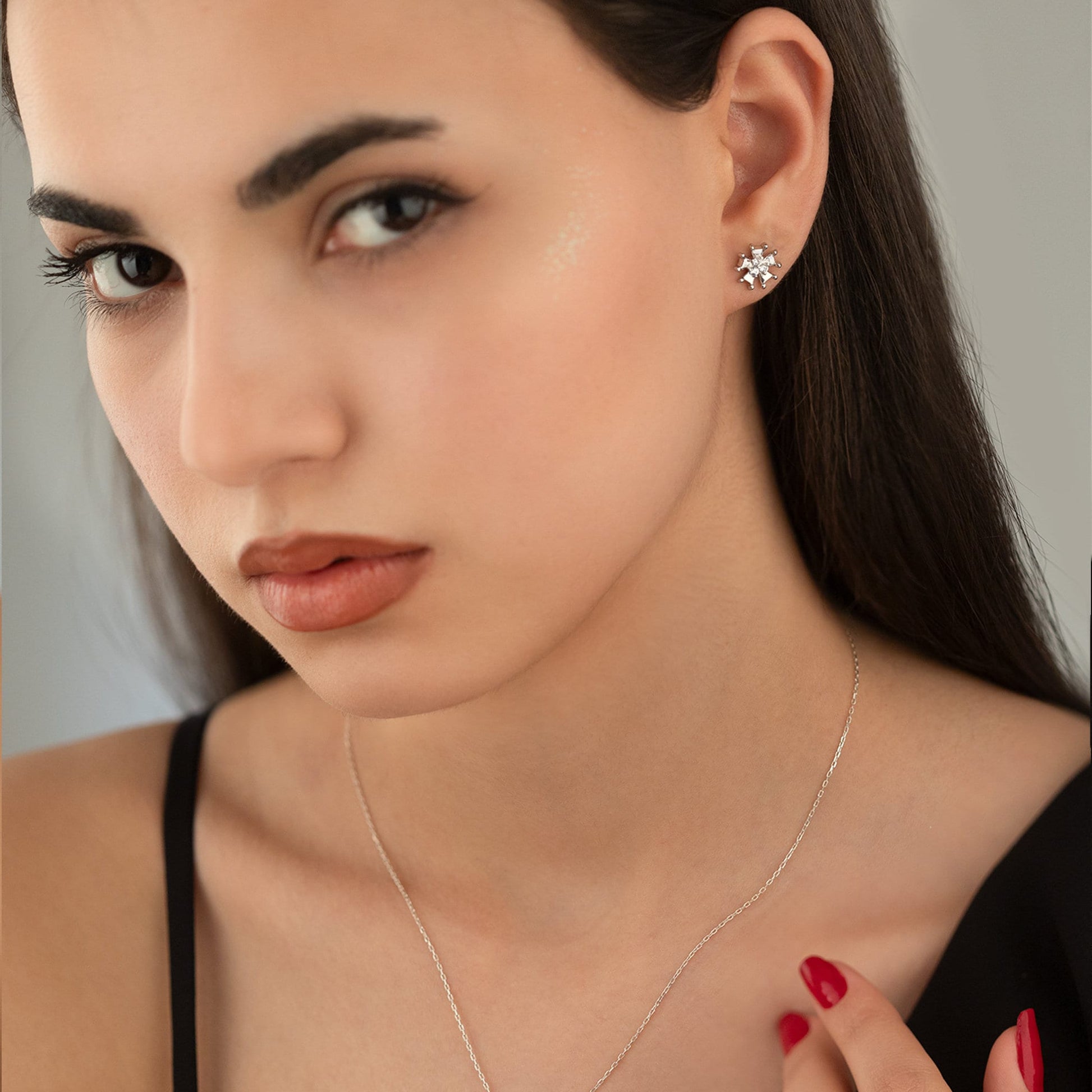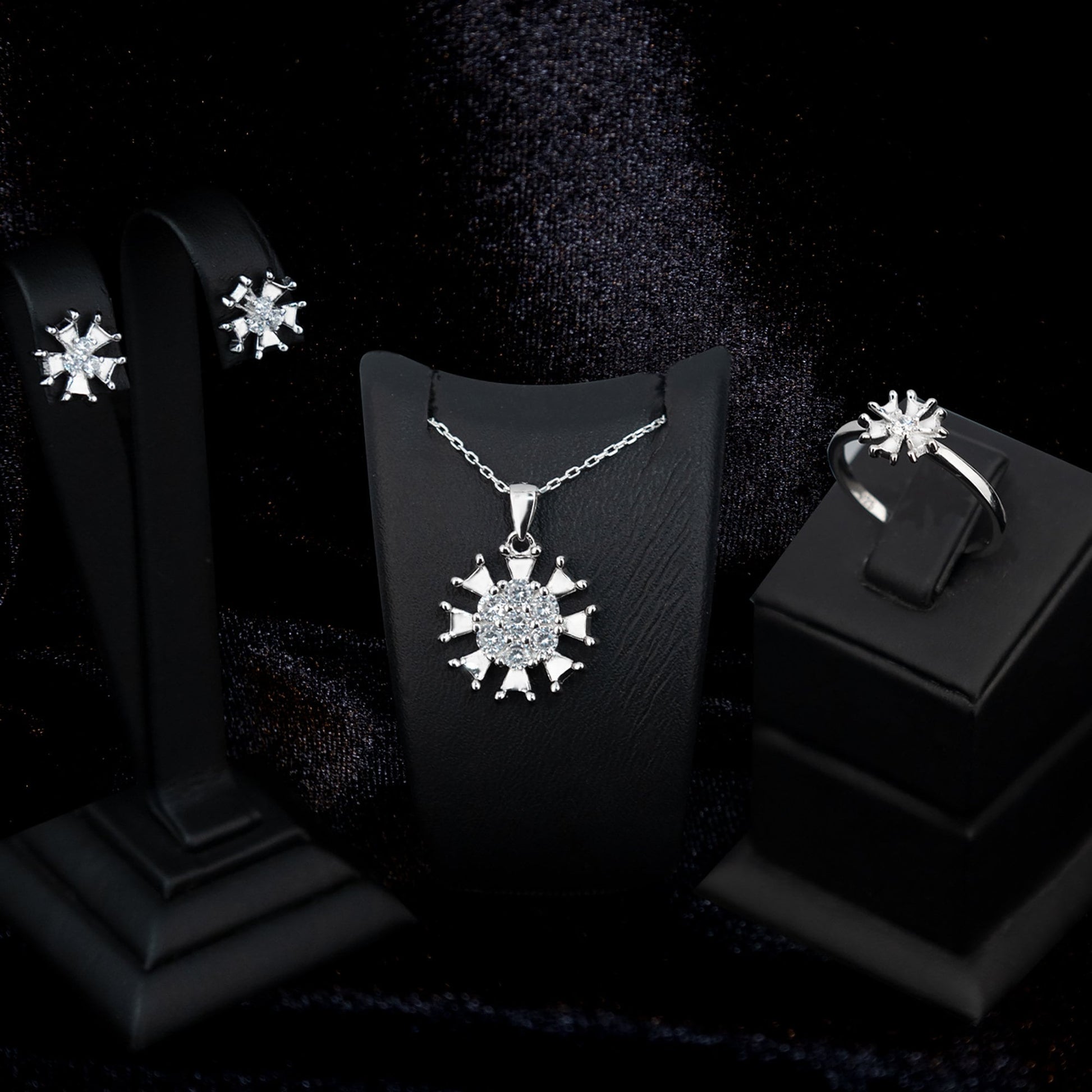 925 Sterling Silver Stone Flower Shape Set 3 Pieces: Necklace, Ring & Earrings