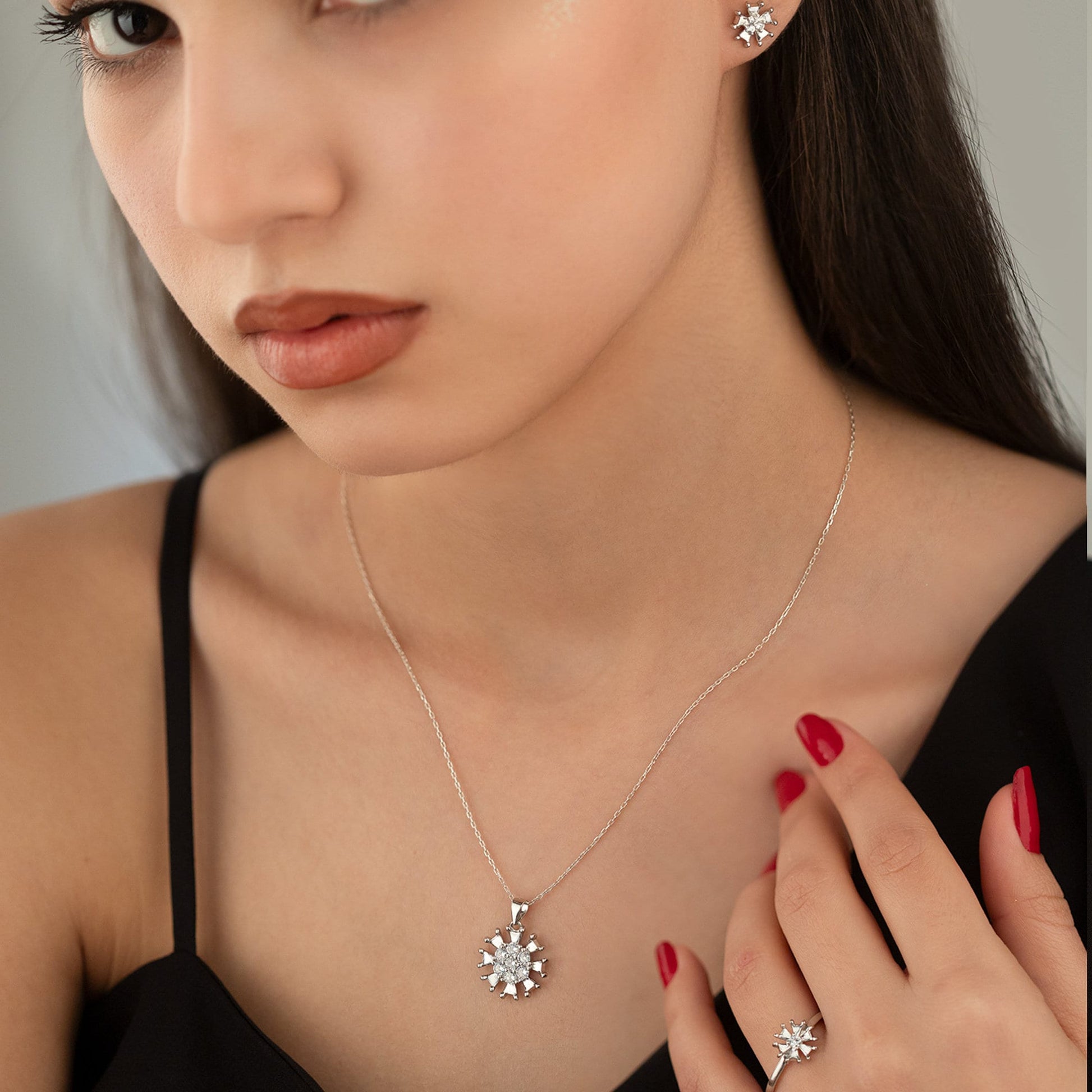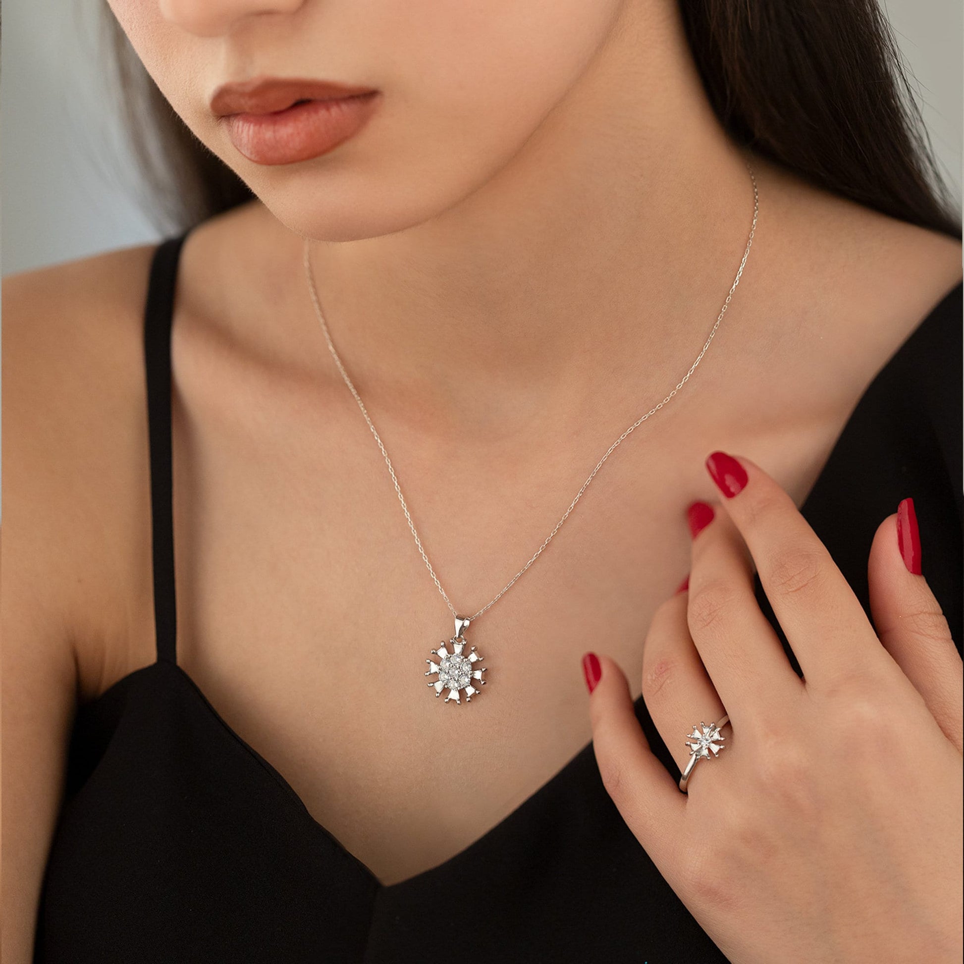 Stone Flower Shape Jewelry Set 3 pieces: Necklace, Ring & Earrings - Valentine's Day Gift - 925 Sterling Silver Jewelry Set - Gift for Her - Handmade Pendant - Gift for Wife