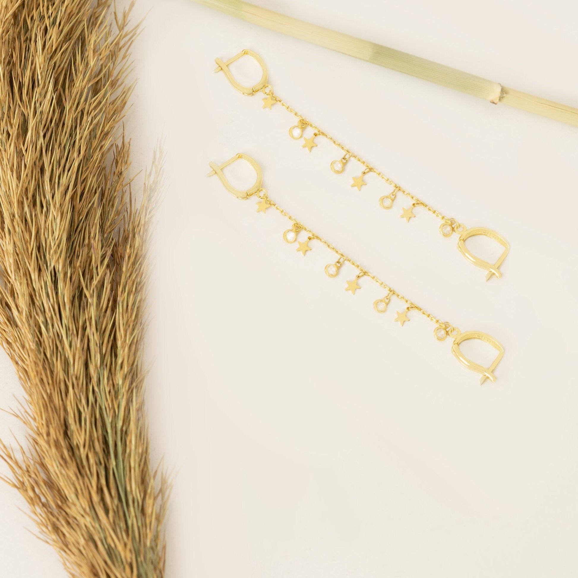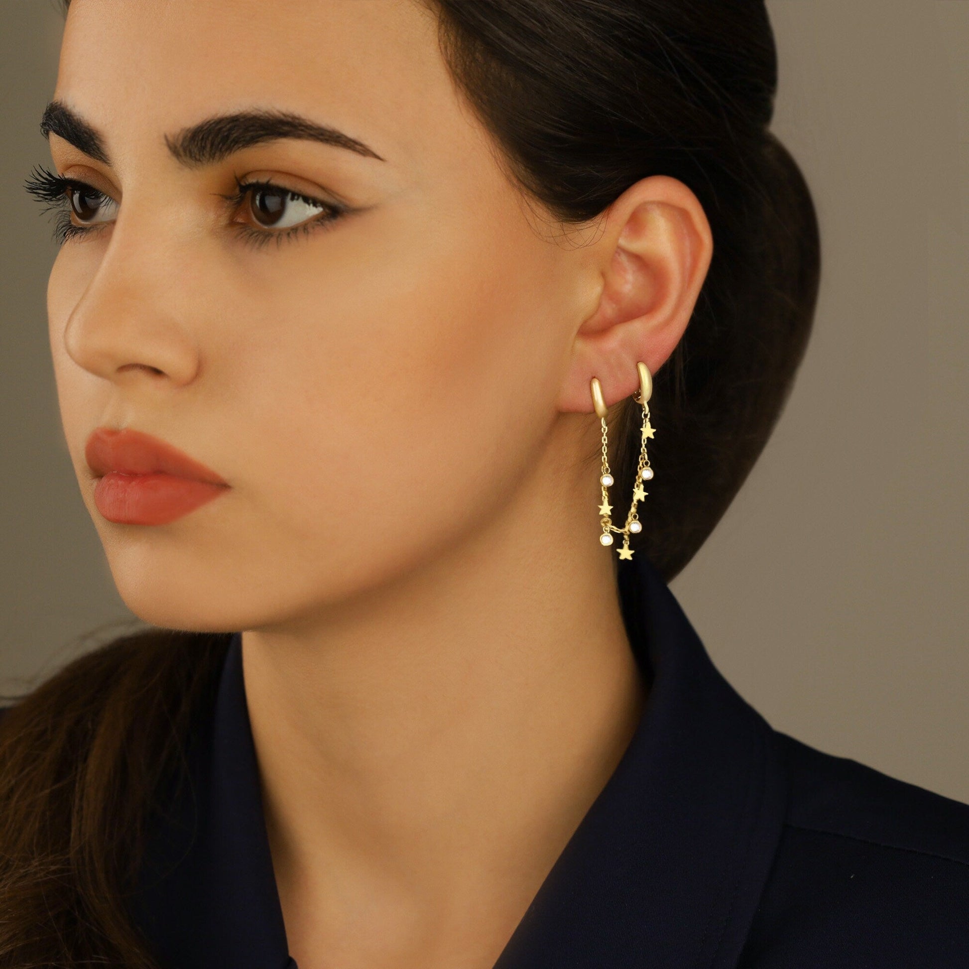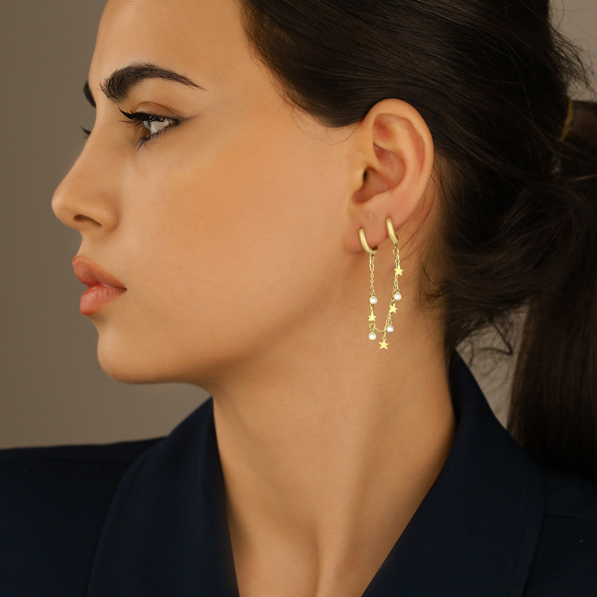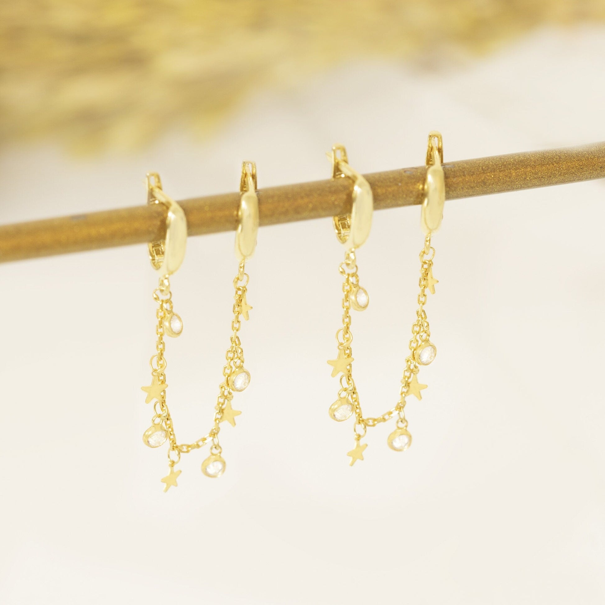 Threader Double Hole Earrings - Tiny Star Hoop Earrings - Diamond Hoop Threader Earring - Modern Jewelry - Celestial Earring - Gift for Her - Gift for Mother
