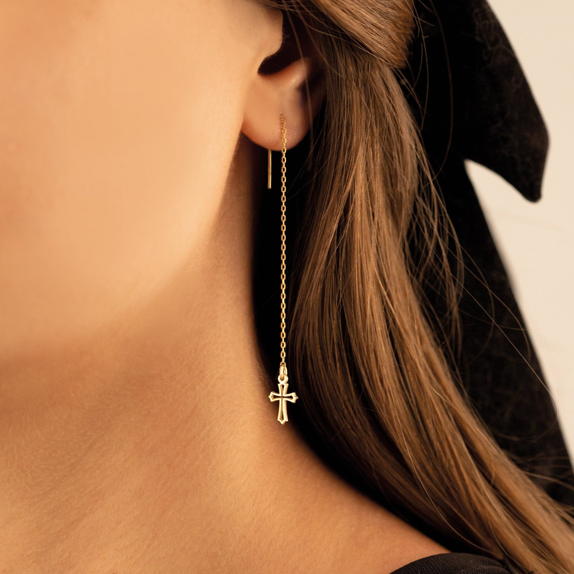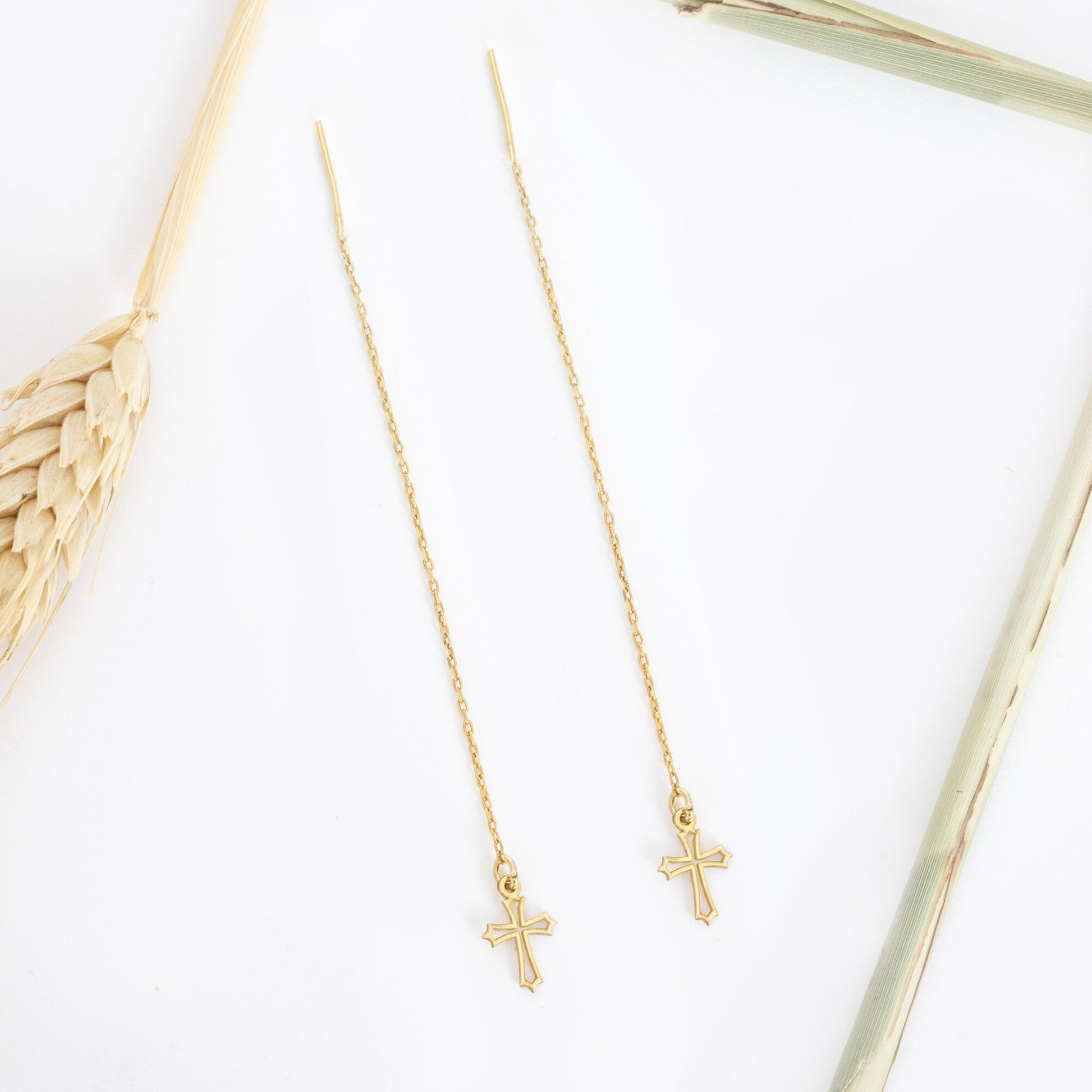 Threader Hollow Cross Dangle Earrings - Tiny Cross Threader Earrings - Minimalist Earrings - Cross Dangle & Drop Earrings - Christian Gift - Gift for Her - Christian Jewelry - Christmas Gift